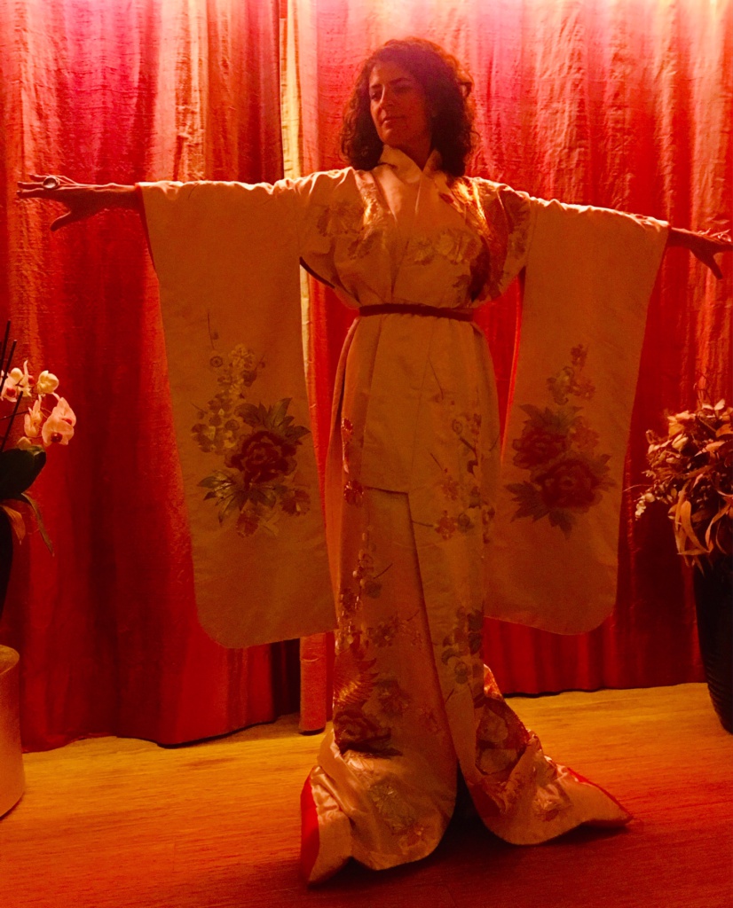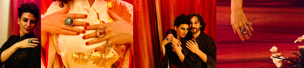 Maria indossa un kimono 玉[Yù]:: FemminileSingolare Kimono 玉 da cerimonia in seta ricamata color perla, oro e rosso, un anello 玉[Yù]:: GioieAlchemiche KalpaKundalini misura piccola e anelli 玉[Yù]:: GioieAlchemiche kalpaGalassia misura grande.